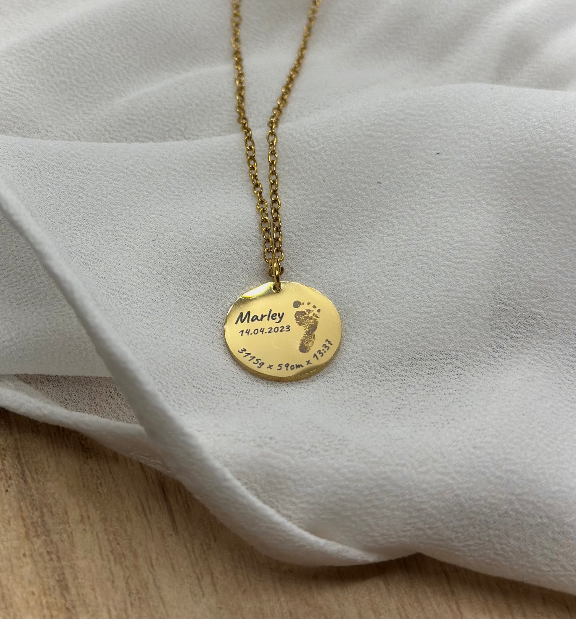 Diese Kette trägt den Fußabdruck eines Neugeborenen und hält einen einzigartigen Moment für immer fest – ergänzt durch persönliche Gravuren.