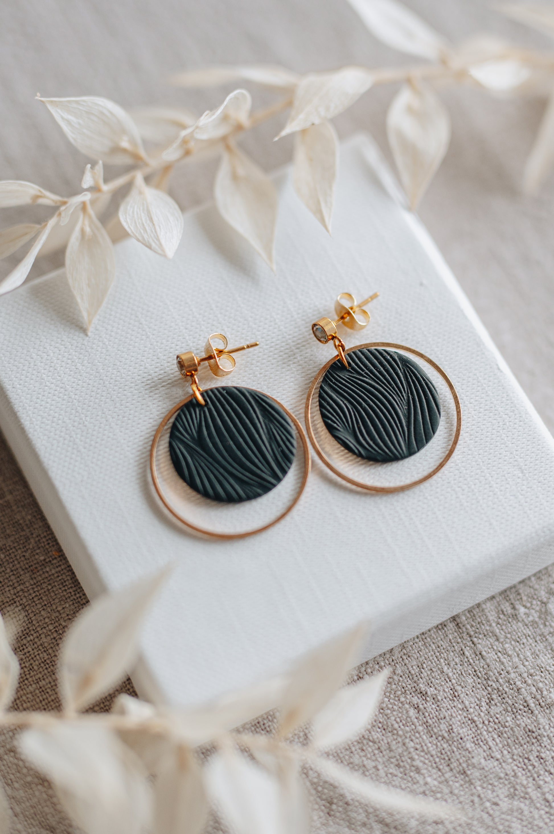 Edle, runde Ohrringe mit einem feinen Ring. Der Anhänger ist aus Polymer Clay und sorgt somit für ein angenehmes Tragegefühl.