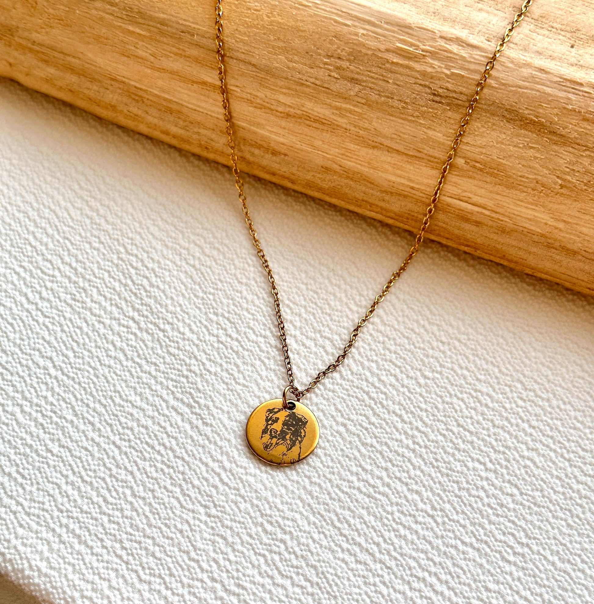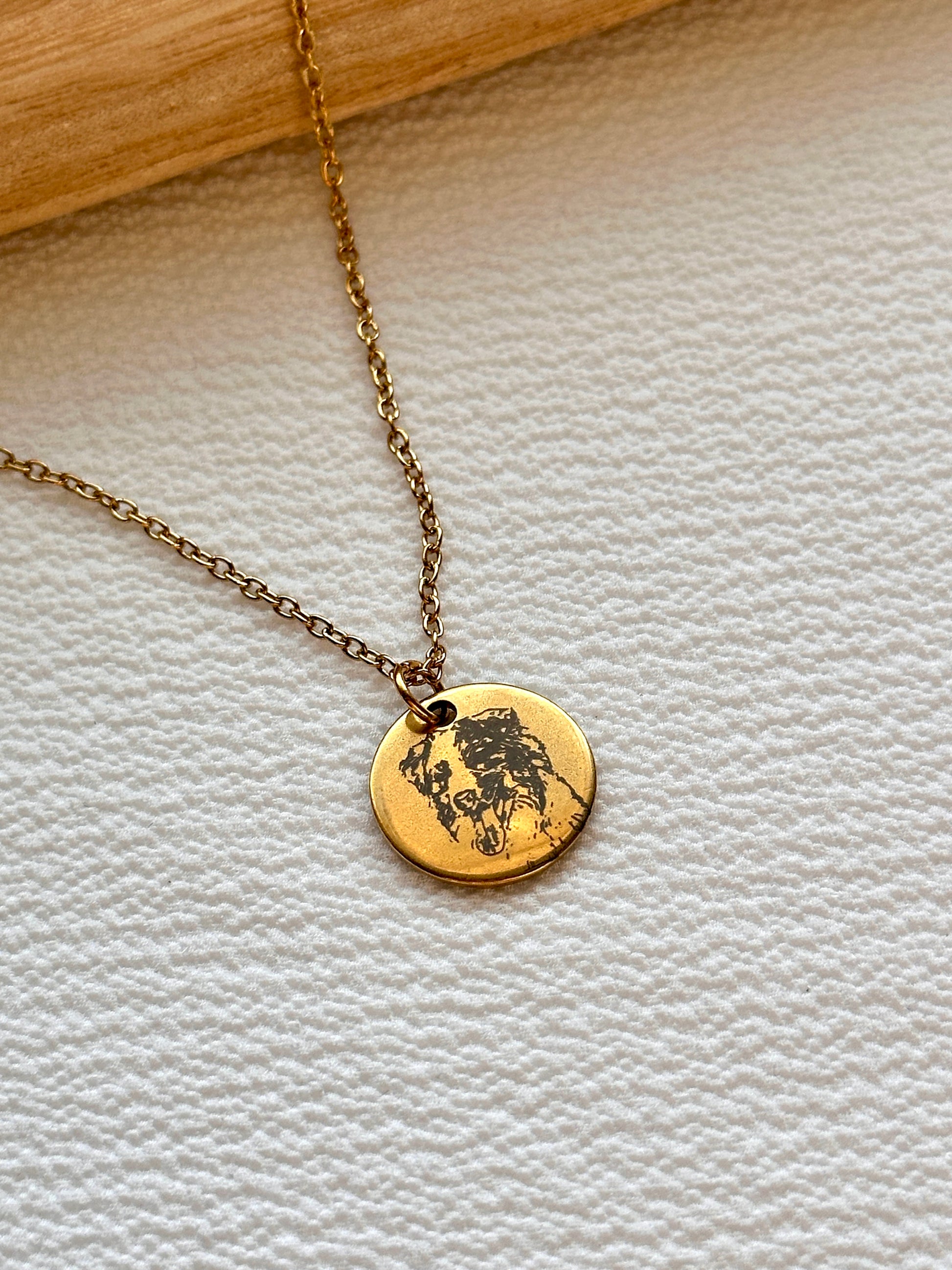 Fein gelaserter Edelstahl in Gold oder Silber, kombiniert mit dem Bild einer besonderen Person oder eines geliebten Tieres, das dich jeden Tag begleitet.